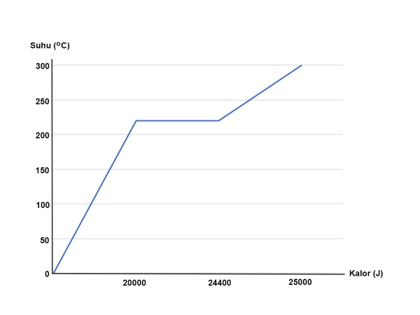 Suatu zat seberat 10 g dipanaskan. Gambar di bawah ini menunjukkan diagram kalor-suhu dari zat tersebut. Titik lebur zat padat tersebut terjadi pada suhu ....