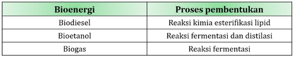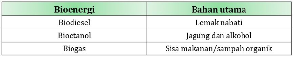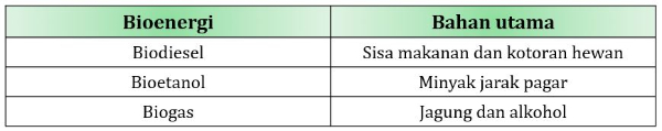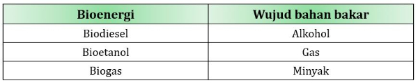 Bioenergi, sebagai bahan bakar ramah lingkungan, telah diterapkan secara luas pada kehidupan masyarakat, seperti biosolar/biodiesel, biogas, dan bioetanol. Perbedaan yang tepat antara ketiga bioenergi tersebut adalah ….