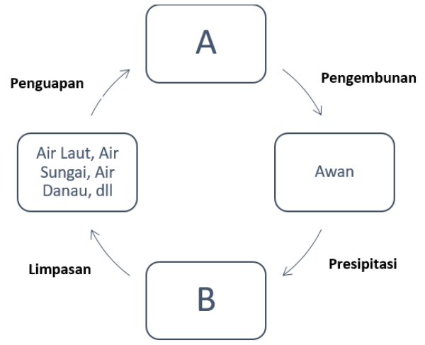 Selama siklus air, air akan mengalami perubahan wujud. Kata yang tepat untuk mengisi kotak A dan B adalah ....
